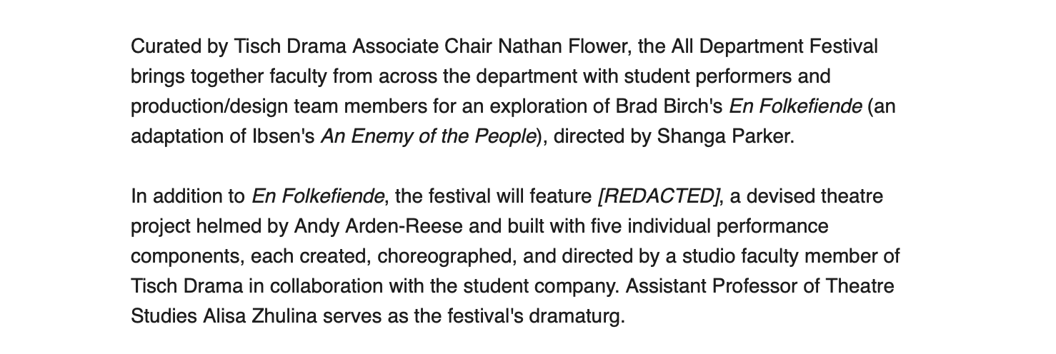 [REDACTED] is a devised theatre project built with five individual performance Components, each created, choreographed, and directed by a Studio Faculty member of Tisch Drama. Every Component deconstructs, subverts, or interprets the narrative of En Folkefiende, the partner production in the All Department Festival. [REDACTED] plunges into a world of silence and secrets and shatters it inside out.